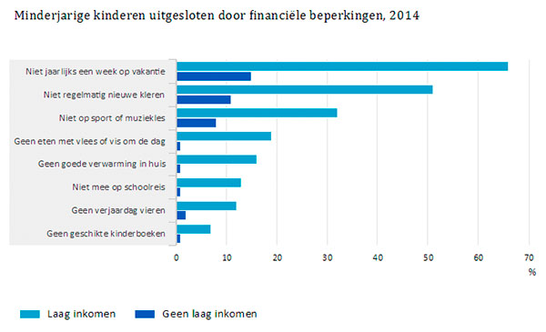 Kinderen uit gezinnen met een laag inkomen kunnen minder vaak meedoen aan activiteiten dan hun leeftijdsgenoten. Zo kunnen ze niet altijd mee op schoolreis en zitten ze minder vaak op sport of op muziekles. Voor meer dan de helft van de kinderen in huishoudens met een laag inkomen is er te weinig geld om regelmatig nieuwe kleren te kopen of om één keer per jaar een weekje op vakantie te gaan.