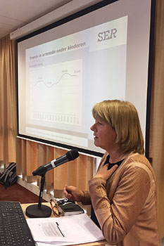 Nicolette van Gestel deelde een persoonlijke ontboezeming met de aanwezigen: de grootste schok in het bezig zijn met kinderen in armoede was voor haar de conclusie dat armoede bij kinderen zo’n hardnekkig probleem is. Armoede onder kinderen is een hardnekkig probleem dat grotendeels los staat van de economische ontwikkeling. De conjunctuur is voor niet meer dan éénderde verantwoordelijk; tweederde van de oorzaken zijn structureel. De meeste zorgen baren de 113.000 kinderen die langdurig in armoede verkeren.